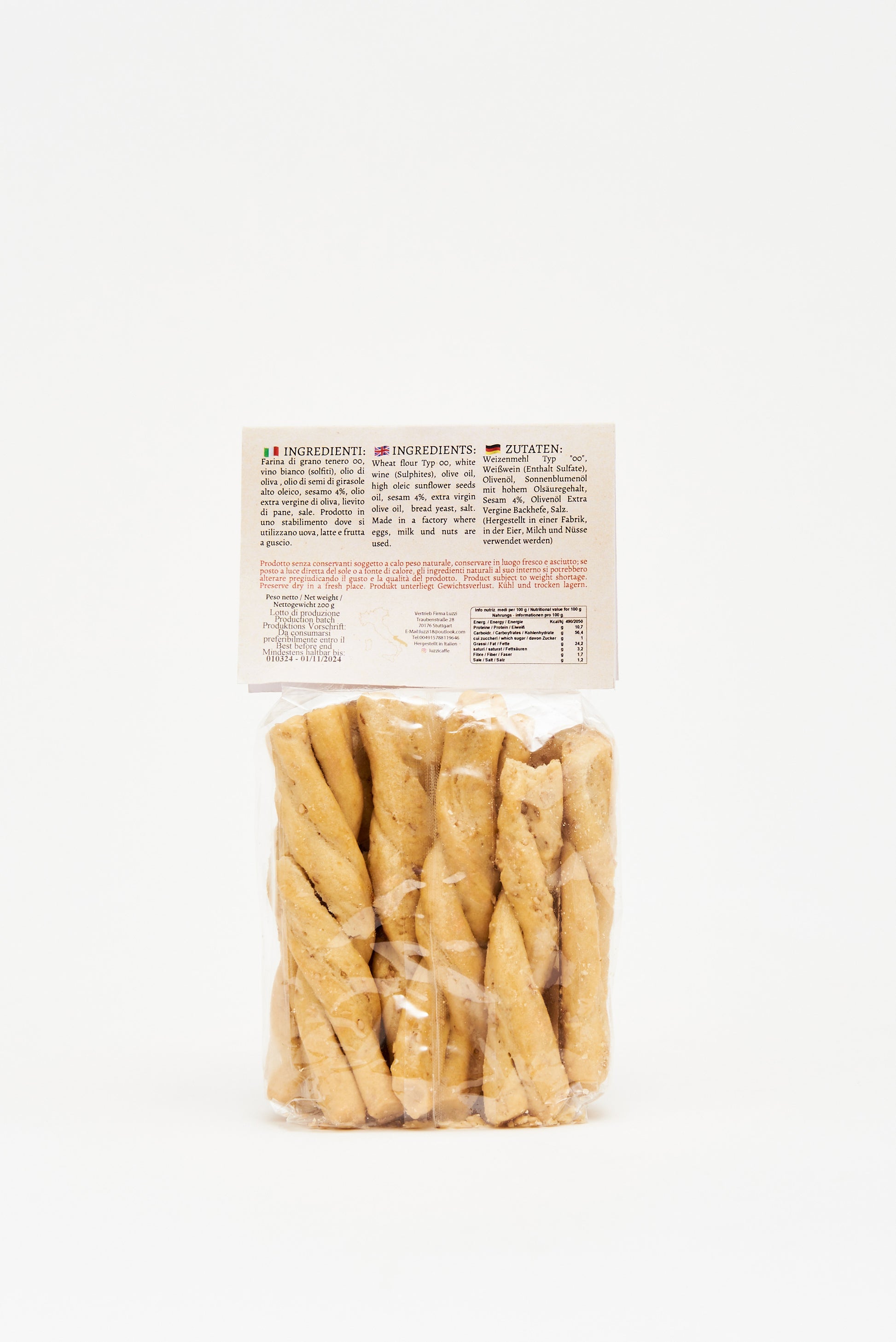 Weizenmehl Typ "00",Weißwein (Sulfate), Olivenöl, Sonnenblumenöl mit hohem Olsäuregehalt, Sesam 4%, Olivenöl Extra Vergine Backhefe, Salz.